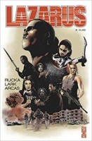 Sommaire : Episode 6.La chasse au dragon, de Greg Rucka & Eric Trautmann (Sc) & Tristan Jones (Ds) → Le monde n'est plus divisé désormais selon des frontières géographiques ou politiques, mais financières. La richesse est le pouvoir, et ce pouvoir se trouve entre les mains d'une poignée de familles. Ces familles sont désormais en guerre. Nous sommes en l'année X+66, et ce qu'on appelle de plus en plus fréquemment la guerre du conclave a mis a mal les alliances et déstabilisé la vie des habitants de la planète. Personne, que ce soit membre de la famille, serfs ou déchet, n'est épargné par le chaos. Casey Solomon poursuit son périple au service de la famille Carlyle. Joaquim Morray se trouve écartelé entre les désirs de son coeur et les exigences de sa famille. Joe et Bobbie Barret decouvrent que la vie de serfs s'apparente a une cage dorée. Alimah Meyers Qasimi et Xolani Nkobi se lancent comme alliés dans une mission commune en Afrique du Nord. Mais ils pourraient la finir en ennemis. Seré Cooper cherche le sujet qui permettrait de la remettre en selle, mais découvre quelque chose qui risque de la couler une bonne fois pour toutes. Et dans la Russie de Vassalovka, le dragon se repose et attend dans sa caverne. alors qu'approche un ennemi implacable. Ce nouveau volume de Lazarus, série désormais culte et fleuron du catalogue Glénat Comics, est une succession de 6 histoires indépendantes. Chaque récit, dessiné par un artiste différent, est focalisée sur un personnage et un endroit du monde distincts. Un tome de transition pour approfondir l'univers dystopique développé par Greg Rucka et Michael Lark. Dans l'épisode 6, coscénarisé par Eric Trautman et dessiné par Tristan Jones, Vladislav Martatovitch est parti à la chasse au dragon dans une région désertique. Il affronte des loups et finit par arriver à l'entrée de la caverne du dragon. Il se prépare à l'affrontement contre Semyon Stepanovitch Morozov, dit Zmey, le Lzarus de la famille Vassalovka
